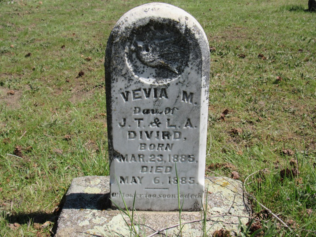 The oldest grave belongs to Vevia M. Divird, born May 6, 1885 and died May 23, 1885. She was 17 days old. Her parents are one of the land donors.