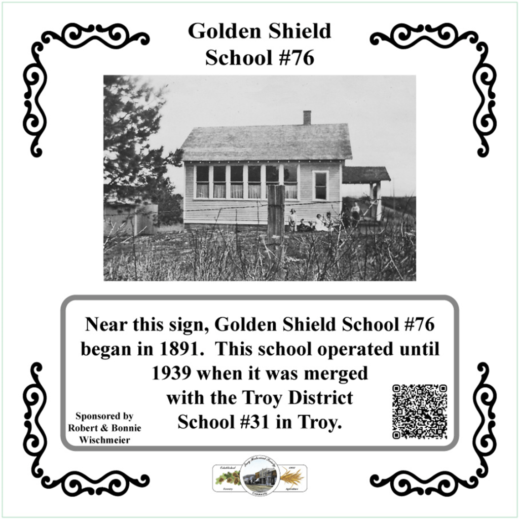 The Golden Shield School, also known as American Ridge School was established in 1891. It was also often called the Harland school, for the family who homesteaded the area in 1885.