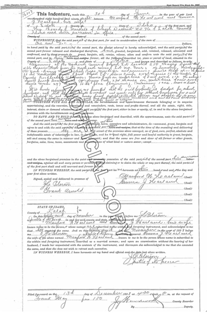 Manford W. Harland’ s land was used for the schoolhouse beginning in 1891. In 1898, Manford and Emma Harland deed land to the school district.